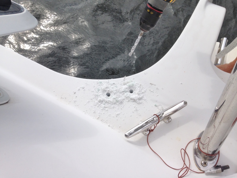 And for us, what’s a boat without some deck wetness?? Discovered during the pre-purchase survey and pooh-pooh’d by the surveyor, no way was Russ going to not deal with it. Sooooo he removed the metal anchor chute dug out much of the wetter sections and let it all bake in the sun for days. Before the next rain we filled up the spaces with West System Epoxy and replaced the anchor chute.