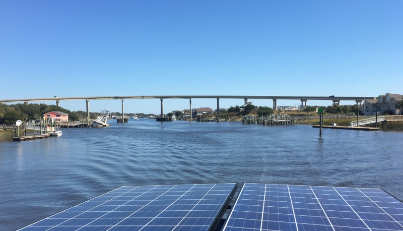 A few miles south of Lockwoods Folly inlet is Holden Beach (one beach north of the scene of tense moments when silly crabbers strung a float line across the ICW- it was new and didn’t sink; we came by in Ortolan and one rudder snagged the line (click here for that story). See, I told you cruising has been pleasantly boring lately. Wouldn’t it be nice to have GOOD feelings about Holden Beach? Yes, there’s hope for that. We read about, new in 2016, town docks along the ICW in Holden Beach. Space for 2-3 boats, water power, access to laundry and wi-fi. Described as courtesy docks by whoever added the info in ActiveCaptain, the town website calls them town docks and the cost is $1.25/ft, plus power. Still, they are a welcome spot in a desert of anchorages. If we (read: RUSS) hadn’t wanted to get moving after 4 nights in Carolina Beach, Twins might have stopped.