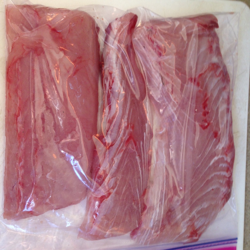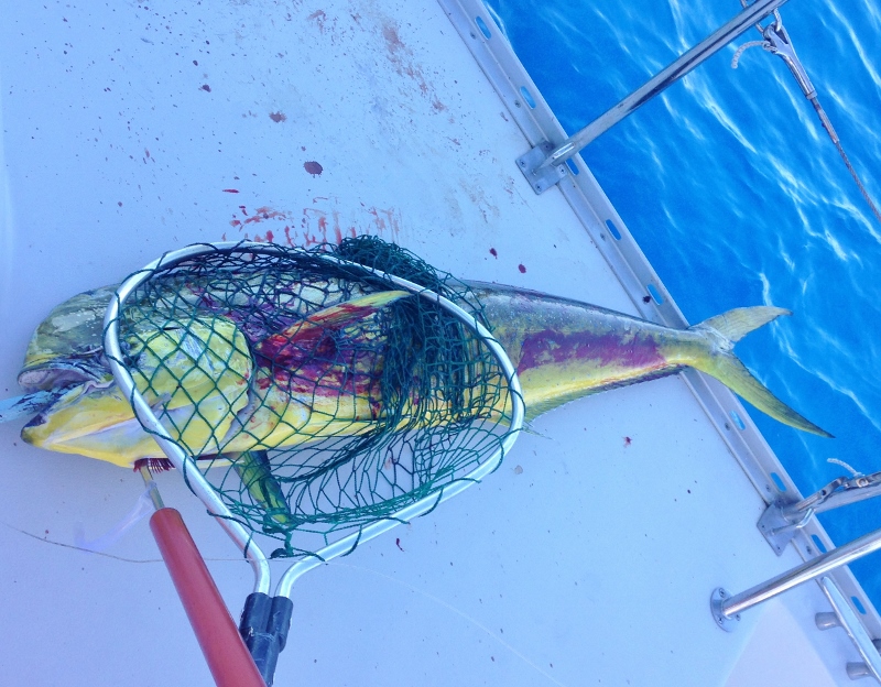 One easy chore needed doing so I sent Russ below so he’d get a break from helm duty. I hear a loud splash and look left, about 50ft off our port side. A flash of yellow/green streaks toward our stern just below the surface. I rush into the salon to warn Russ of a possible “Fish on!” and then ZZZIIIIINNNNGGGG. I’m starting to feel like Pavlov’s darn dog: hear the sound, shout Fish On, take the wheel, (being sure to stop Autopilot) and follow instructions. I now “get” the excitement of catching dinner, plus gotta get our money’s worth buying the rod, reel, line, lures, hooks, weights, gaff, net, hook puller, gloves. Sure beats the Cuban yoyo we used to have; I’d always worry we’d catch more than we could handle. We still have one yoyo and sometimes we attach it at the port stern for two lines in.