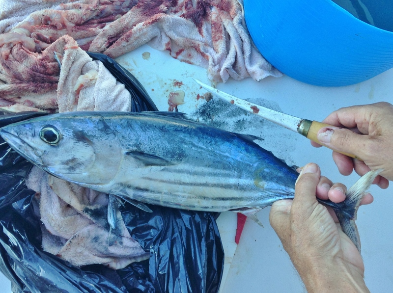 A short time later Russ landed a SkipJack tuna, ensuring at least one fresh catch dinner. Still only half way to George Town, let’s keep fishing! Sigh.