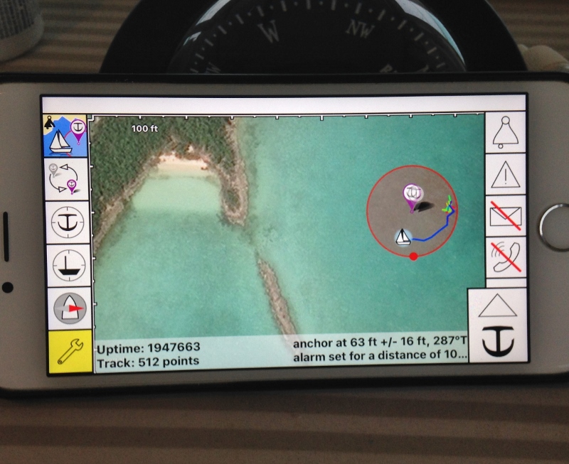 Above is our anchor drag alarm app in use. You set it using the “anchor down” symbol when you drop the hook. Then set the alarm distance and that’s your circle. If the boat goes out of the circle, the alarm sounds. So far the only times it’s sounded is when we forget to turn it off when leaving an anchorage. Our Ultra anchor has been worth every penny so far.