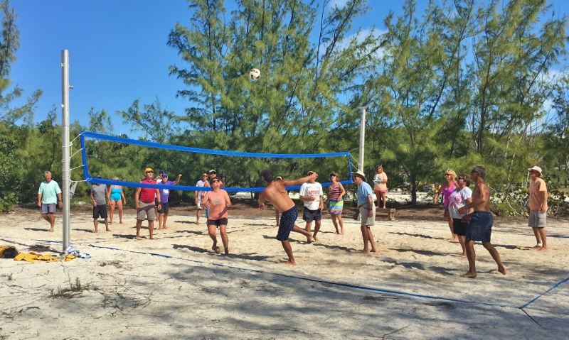 Stopped by and finally got to meet the famous Sara and Monty Lewis, creators of the Explorer Charts & Cruising Guide and the gold standard source for local knowledge throughout the Bahamas. Yes, they really still cruise and check out places themselves, although the guides get updated from other sources too. Exchanged boat cards, thanked them for all they’ve done and headed off for the final regatta event: fun volley ball.