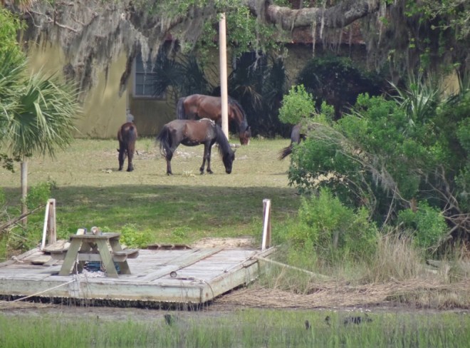 Our first Georgia stop was the lovely but tricky Plum Orchard anchorage on the Brickhill River. Tricky because a hard mound shoal guards the entrance “on the green side” over to the center and if you don’t know that (thanks to ActiveCaptain), TowBoatUS or SeaTow might become your best friend that day. It’s a few miles north of the larger, more accessible Cumberland Island anchorage down by Dungeness. (accent on the “ness”).