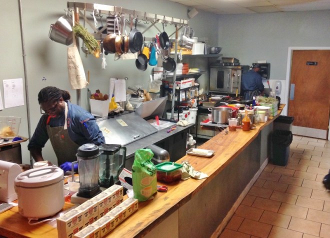 Behind her is the open kitchen. You can see how compact the place is.