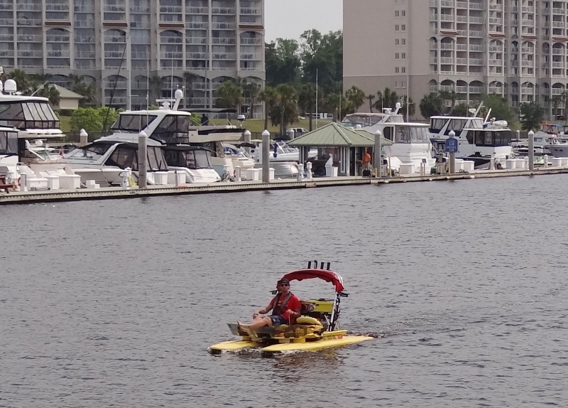 In the North Myrtle Beach area are two marinas opposite each other; both with Barefoot in their name. These cool water pedal-board gizmos came from Barefoot Landing Marina which is a long face dock right next to the Barefoot Landing Shops & dining complex. Not sure what they are or how they operate but I’d be willing to find out!