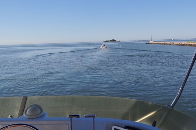 Sunday, July 30 was a lovely day and just perfect for a final boat and cushion washing and getting everything put in its place and ready for heading out into the big blue water. The batteries got equalized, the dry packets got cooked in the oven (they eat moisture), lights and sounds tested, bridle re-attached and charts reviewed. I’d read about a product on The Boat Galley, called Concrobium, which was touted as being a near miracle killer and preventor of mold and mildew, two determined nasties on a boat. Sprayed it on our exterior cushions, dinghy life jackets and the horribly mildew prone VHF radio cord on the flybridge. Maybe I’ll remember to let you know well it works.