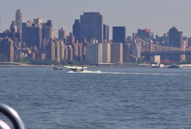 Before the Hudson and the spot of Sully’s Miracle, we watched a seaplane touch down near the United Nations on the East River, probably scaring the crap out of the boat behind us who swerved to avoid what he figured would be a collision.