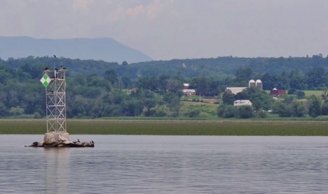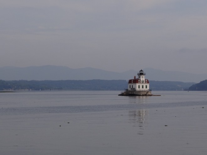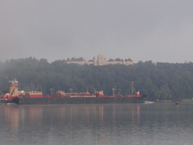 Our anchorage spot between Esopus Island (just north of Hyde Park) and the eastern shore was calm, but the trains made it not so peaceful. Up “early” then, as were two tugs pushing long barges north toward Albany. Scenery continued to delight and while not “autumn foliage” gorgeous, you couldn’t help but smile.