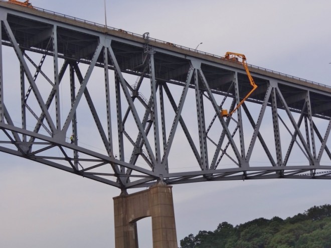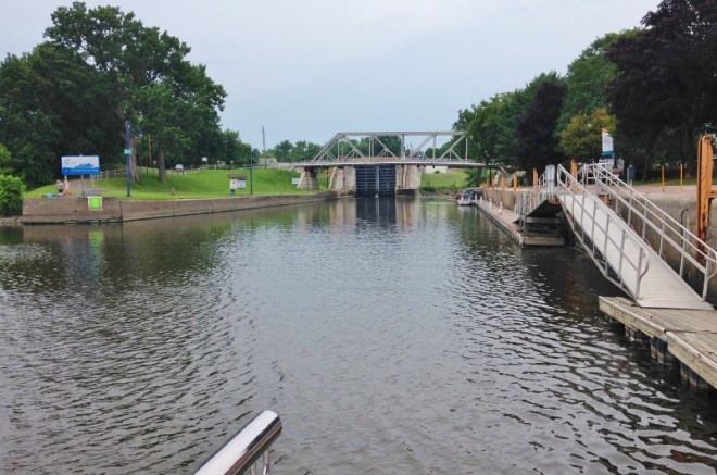 Too bad no Go-Pro set up for this first event. We had lines ready, gloves on and a boat hook within reach. We didn’t know what the “grab onto” situation would be and as you can see below, it’s essentially that large metal pipe. Of course I couldn’t get the end of a line around it- see how far you have to lean over the railing? I should have used the boat hook to grab the ladder and pull the bow in, then get the line through. After three tries we managed. But then the pipes are so far apart that we could only hold on to one at mid-ship. Russ took over the holding on. By the time we got situated, the lock was already slowly filling; thankfully it was a calm event and we exited in one piece, although my nerves were sorely frayed.