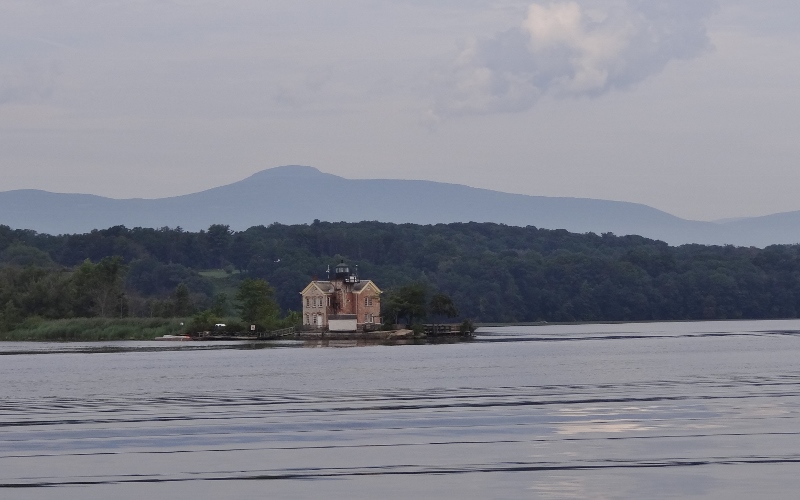Our anchorage spot between Esopus Island (just north of Hyde Park) and the eastern shore was calm, but the trains made it not so peaceful. Up “early” then, as were two tugs pushing long barges north toward Albany. Scenery continued to delight and while not “autumn foliage” gorgeous, you couldn’t help but smile.