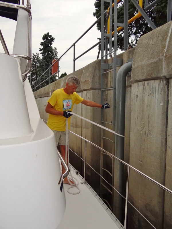 Too bad no Go-Pro set up for this first event. We had lines ready, gloves on and a boat hook within reach. We didn’t know what the “grab onto” situation would be and as you can see below, it’s essentially that large metal pipe. Of course I couldn’t get the end of a line around it- see how far you have to lean over the railing? I should have used the boat hook to grab the ladder and pull the bow in, then get the line through. After three tries we managed. But then the pipes are so far apart that we could only hold on to one at mid-ship. Russ took over the holding on. By the time we got situated, the lock was already slowly filling; thankfully it was a calm event and we exited in one piece, although my nerves were sorely frayed.