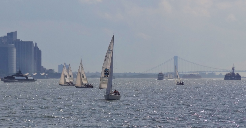 Lower Hudson closing in on Miss Liberty- sailing club, tour and dinner boat (far left), ferry and tug & barge