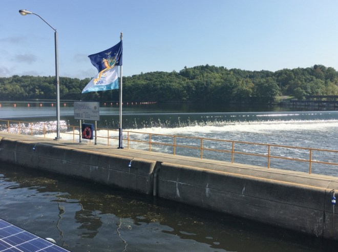 One more lock south of Waterford and that’s the Troy Federal Lock. This time we were prepared with a boat hook to grab the ladder and a line for Russ to put around the vertical pipe.