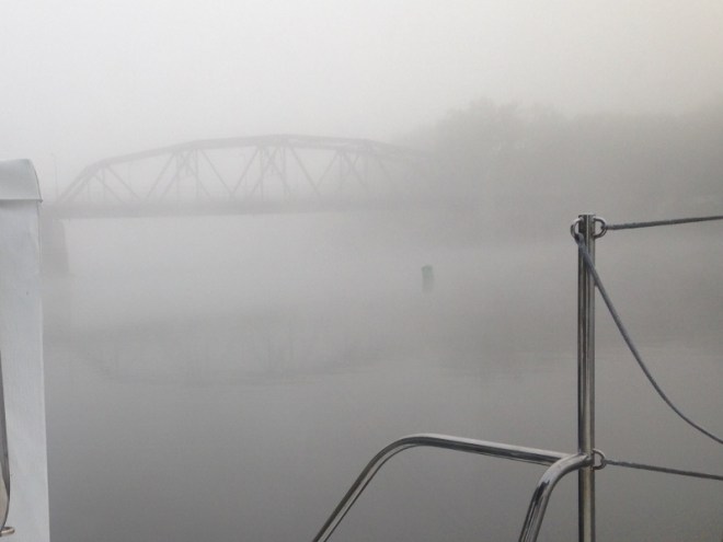We gave m/v Gypsy some tips about the old canal towpath and museum and headed off the next morning once the fog cleared.