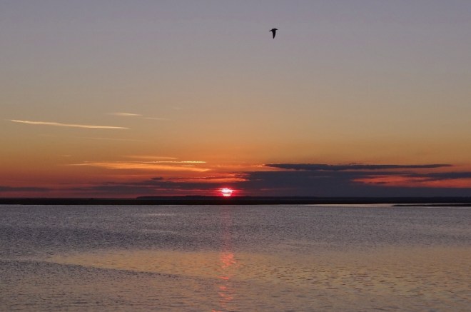 Tried out another new-to-us anchorage and it’s a keeper. Morning offered up this pretty red glow that perhaps warned of lousy weather to come, but not today.
