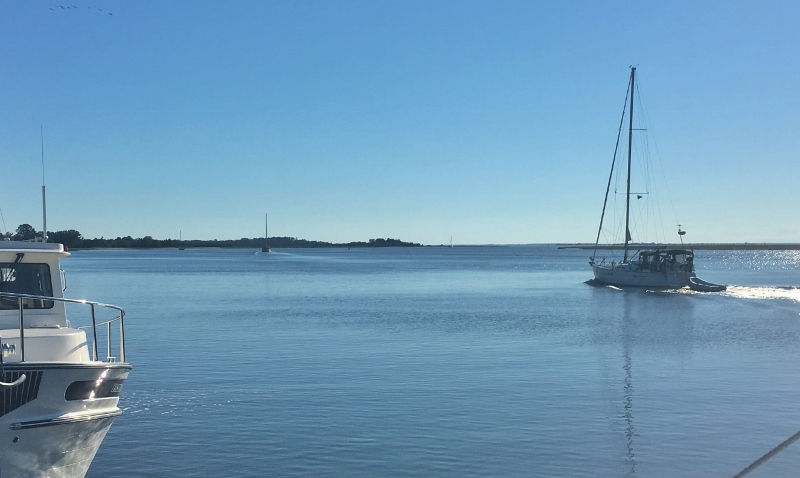 S/V Fleetwing, whose ActiveCaptain handle is Bob423, comes past the marina to anchor off to the right