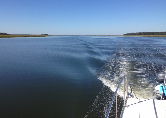 So the newer version of Navionics that runs on the iPad (but not on the old E120s at each helm) is the Captain’s new best friend. It’s got color, dots that show the shallower water (you define the depth) and shows you the deepest water path through the channel/ICW. Traveling through the southern half of South Carolina and all of Georgia requires luck, nerves of steel, accurate electronic charts, oh and a boat that only needs 3ft of depth! 🙂