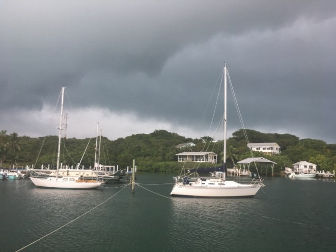 We arrived (as is usual for us) ahead of a cold front, because that’s often when conditions are mild. Russ went ashore to the pink rectangular gov’t building to clear customs but the official had left early so, well, it’s the Bahamas mon.