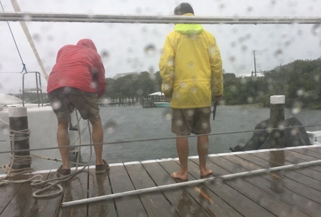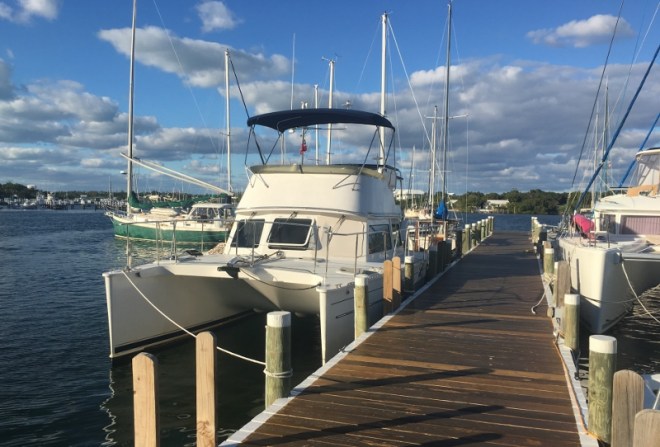 The large sail cat on the dock opposite us had a line tied to a dock cleat- bad idea.