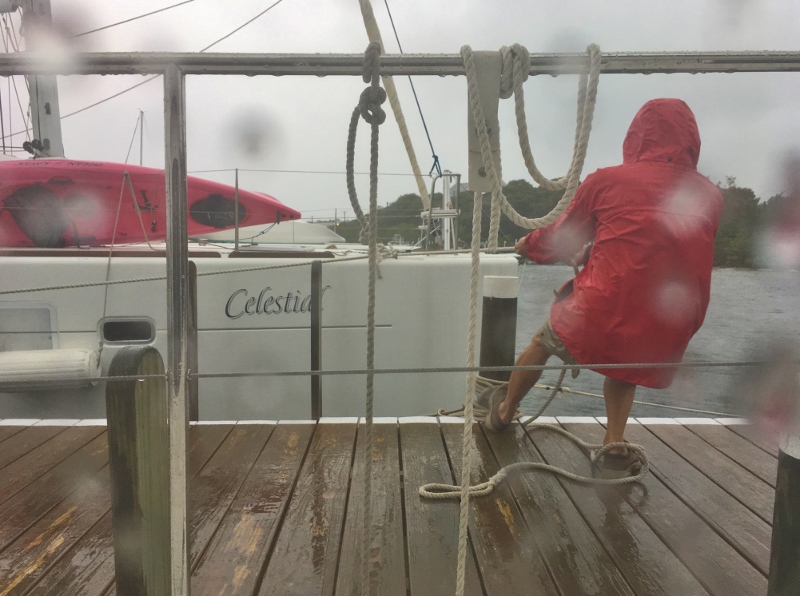 The large sail cat on the dock opposite us had a line tied to a dock cleat- bad idea.