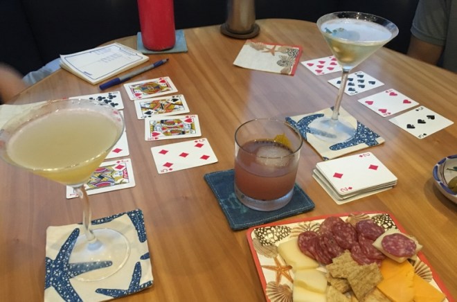 Cribbage never interferes with happy hour! Today our esteemed guests chose martini cocktails, those garlic stuffed olives coming in handy for Benj’s dirty martini