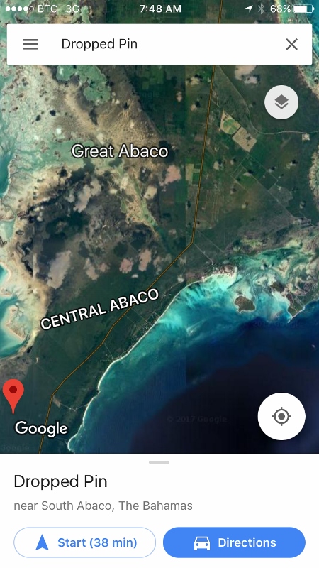 The blue hole had to be located on Google maps so we could find our way there. If you recall from the Marsh Harbour post, the roads were begun by Owens-Illinois who created primary and secondary logging roads. We had to be able to find the turnoff onto the correct logging road, then drive west until we’d come to what we hoped was the obvious spot to park near the blue hole. Thanks to Google we did not get lost!