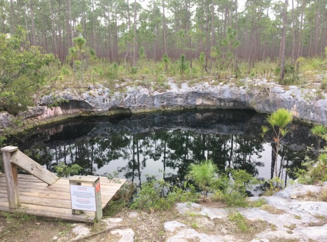 Much further south sat our next and final stop of the day, Sawmill Sink Blue Hole. First we had to backtrack to the Great Abaco Highway and then drive, oh at least another 10-12 miles south. Just to be clear, “paved road” doesn’t mean quite the same as in the States; 40mph is a safe speed. Plus, the car did NOT have a spare tire and per the contract we were responsible for all costs should we incur a flat. No way do we want that adventure today!