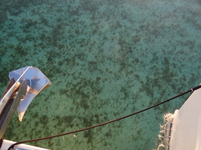 Without a chart plotter you’d have no idea where to go, as the bottom everywhere looks just like this. However most of the banks are only 1′ – 3′ deep! On our chartplotter, Explorer Charts shows a little dotted line to safely bring you thru a narrow path of slightly deeper water. This was our second trip via this route, but we decided to kick things up a notch & anchor overnight right in the midst of it all.