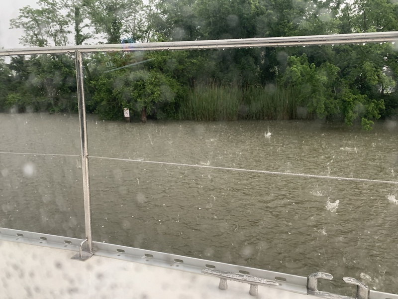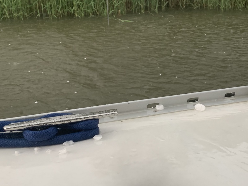 Overall our trip back north was uneventful, well … except for our haul-out & … a hail storm!  While docked at Delaware City Marina, we walked to get take-out at a nearby crab shack, as we were under several weather warnings which didn’t disappoint!  Although only quarter-sized, we had quite the show & boy was it loud on our fiberglass hull.  While hail may be common in many parts of the country, this is only the second time in my life I recall sizable hail – the first was in the late ’90’s.  Our house in Essex sustained several thousands in damage including damaged windows & broken glass.  For several years you still saw the occasional dented car.