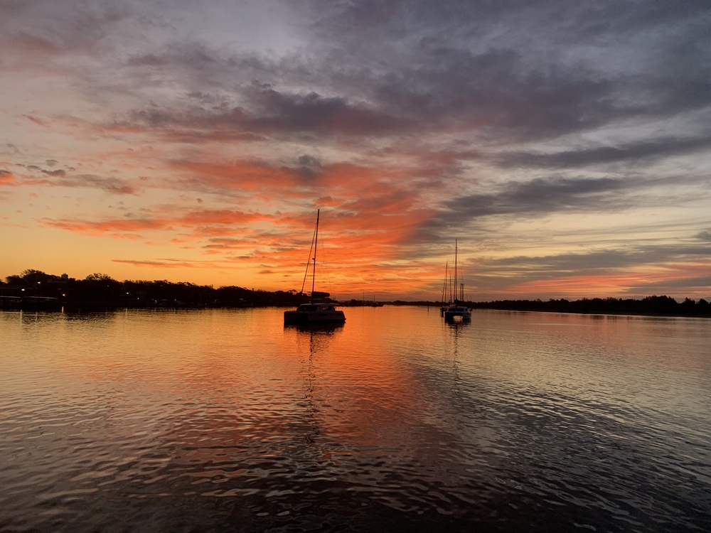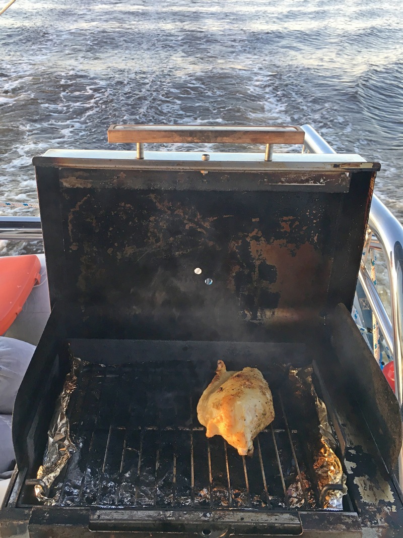 coast which even meant grilling our chicken dinner underway just before setting anchor at sunset up a creek. Surprisingly our grill often gives me problems, always blowing out, etc., but apparently it must be a marine grill, as it worked perfectly underway zooming down Winyah Bay!