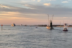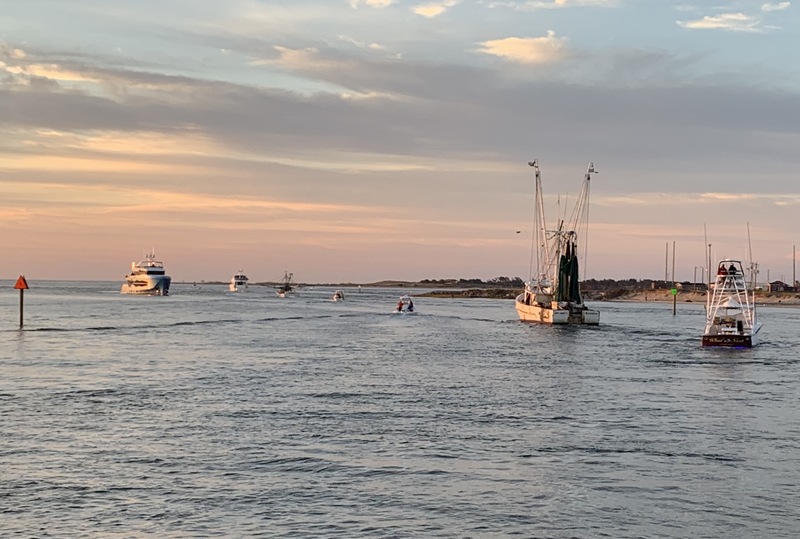 The parade leaving out from BeaufortWith an excellent weather forecast, we decided to head offshore from Beaufort Inlet to Masonboro Inlet (Wrightsville Beach), onward to Carolina Beach & down the Cape Fear River into Southport – about 100 miles. We like to do this trip offshore if possible, as this portion of the ICW has some of the worst shoaled areas, a few opening bridges & there is a spot near Camp Lejeune which sometimes gets shut down for hours at a time due to military training & live fire exercises. The perfect weather was … perfect & we even had a 2 knot current with us down the Cape Fear. At Southport we enjoyed a great dinner at Joseph’s – one of our favorite Italian restaurants & it’s even located right in the marina.