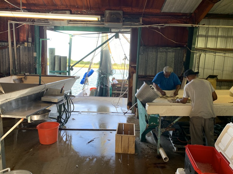 We’ve been on the hunt for fresh shrimp, but have had bad timing at some of our usual stops.  Fresh shrimp is truly right off the boat, so you need to be there when a boat comes in, as it’s unloaded, processed & shipped off within hours.  While stopping at Thunderbolt, Georgia we spied an old building that had “the look”.  We walked up, but were disappointed as a sign on the door said “NO SHRIMP”, but as we continued around the building, an overhead door was open & we saw shrimp!  The workers were about half-way thru the unloading & promised us some if we came back in an hour – “whole or headed?”  An hour later, we bought 5 pounds at a great price – headed – thank you.  We had some for dinner (they were fantastic!) & now our freezer is nicely stocked with enough shrimp to last us a few months.