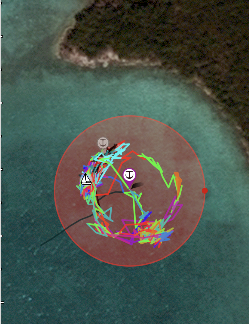 mile harbor, we spend much of the time in a protected area called Red Shanks behind Crab Cay. There are 6 different “holes” – areas with 2 or 3 sided wind protection. Some are fairly deep with rooms for up to 20 boats – this one spot is fairly shallow & barely room for one boat – us! High hills to our north & east cut the wind down by half. Our anchoring app to the right gives you a visual idea of the wind’s “clocking” with each cold front – the little anchor symbol in the middle is our anchor – the colored lines show our boat’s track as the wind takes us around during about a week’s stay.