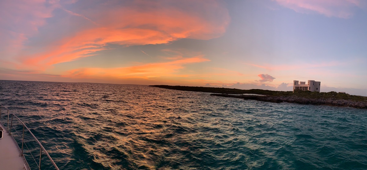 This is our first stop heading back north up the Exuma chain. This sunset picture shows a peaceful scene, however 1′ – 2′ waves rocked us silly for a few hours until the front switched the wind around. By midnight the wind clocked around to shore side giving us some relief. The faux castle is actually just someone’s house, although we haven’t seen anyone around in a few years.