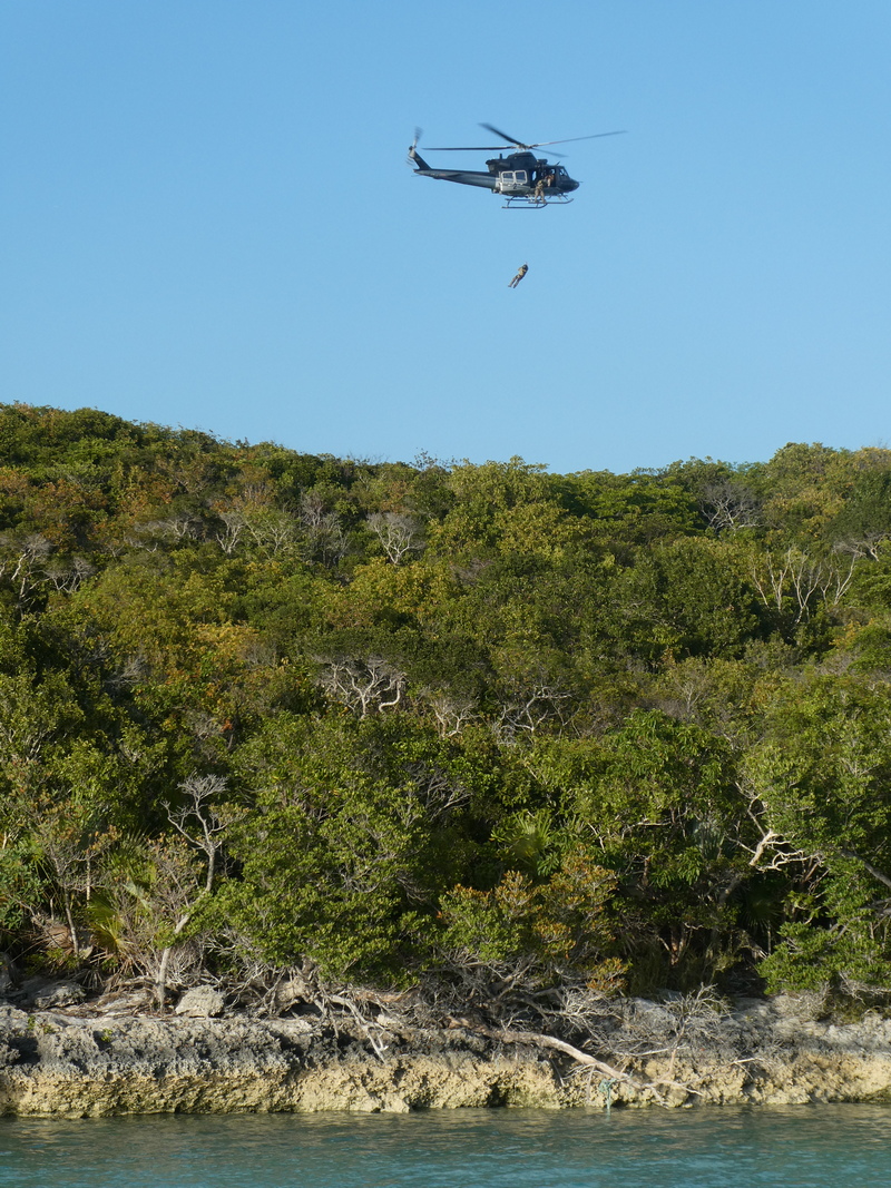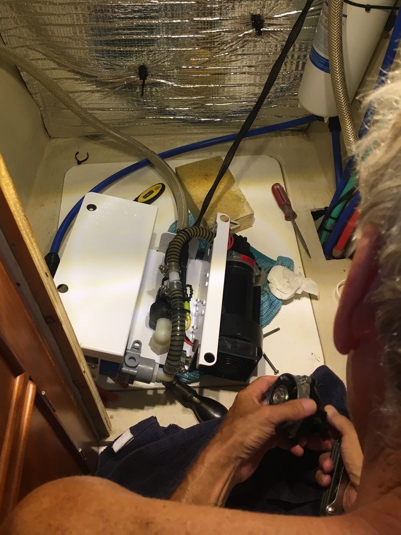 Military? helicopter exercises on adjacent Crab Cay – no markings, tail numbers or IDs?? Better not to ask …While waiting for winds to die down, there are always various projects to keep us busy. I’m making a watermaker repair replacing the feed pump. Here’s Lori’s latest creation!