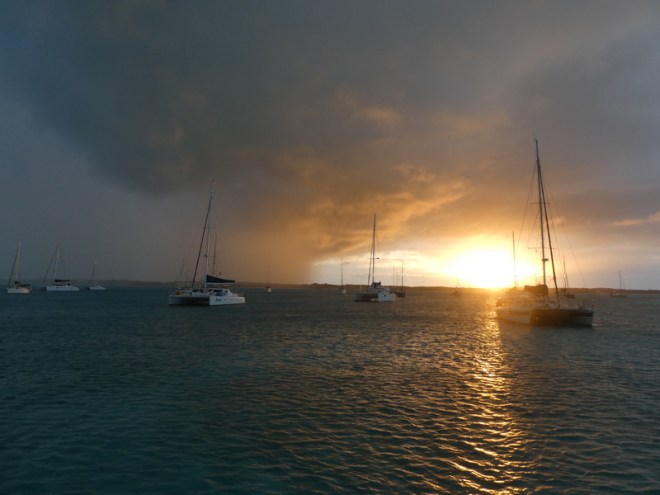 What wind?This is our protected, beachside anchorage we moved to the next morning, since the wind was forecast to be blowing 25 – 35 knots for the next 4 – 5 days. Our move, however, was not without a bit of drama. As we passed by 2 sailboats, they started yelling & pointing, then air horn blowing, again & again. Finally we motored over closer & were told we couldn’t re-anchor because that’s “their spot” they were planning to move to later in the morning! “Their spot” was a large corner for the anchorage with plenty of room for several boats. We weren’t even necessarily anchoring there anyway – we were simply making our way past them. Later on the beach he told me that the day before “everyone” had pre-planned their anchoring spots, including where they might be moving to when the wind changed, so they were pissed that we (& another powercat before us) had just moved on our own?!? Anchoring situations can be stressful, but this was a first!!
