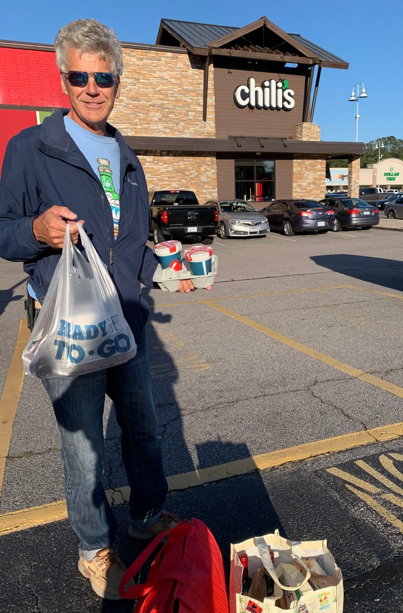 at our favorite restaurant (Spoon River) in Belhaven, NC where we picked up a huge order of fantastic shrimp & grits which was enough for several dinners & even a lunch. On the other hand, we had to lower our standards in Great Bridge, VA as there was only a Chili’s next to the grocery store in walking distance. The only saving grace was they had their margaritas to-go as well! Their curbside pickup was a little sloppy as they were repeatedly going car-to-car close-up to opened windows asking which order was whose – not a great system. We kept stepping further & further away from curbside until we were on the other side of the parking lot by the time our order was ready.