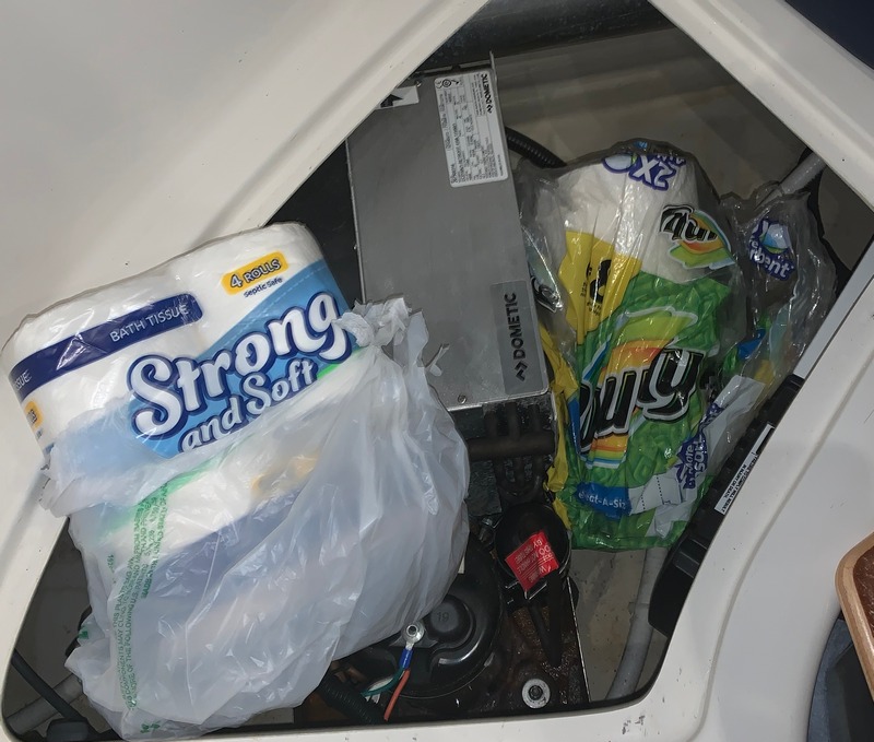 We hit the mother-load, finding almost-forgotten spare toilet paper & Bounty paper towels under a seat hiding-out with the air conditioning unit.
