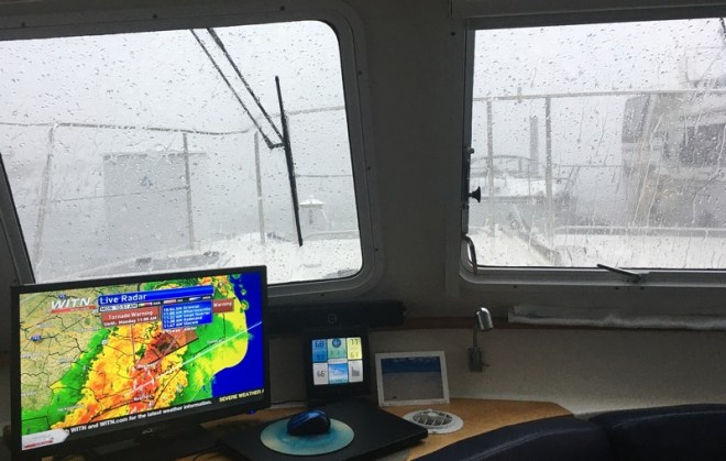 We’re seldom as far north in early spring – it’s cold & stormy! After a while you almost get used to thunderstorm warnings, gale warnings, tornado watch, blah, blah, blah – o.k. – not really! For the worst weather, we’ve mostly managed to be hiding in marinas, but have been anchored out many cold nights with temps down to 44 & inside cabin temps as low as 49 by morning – hmmm … who gets out of bed first to start the generator so we can start up the heater??