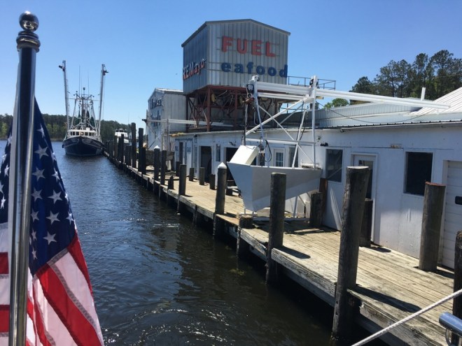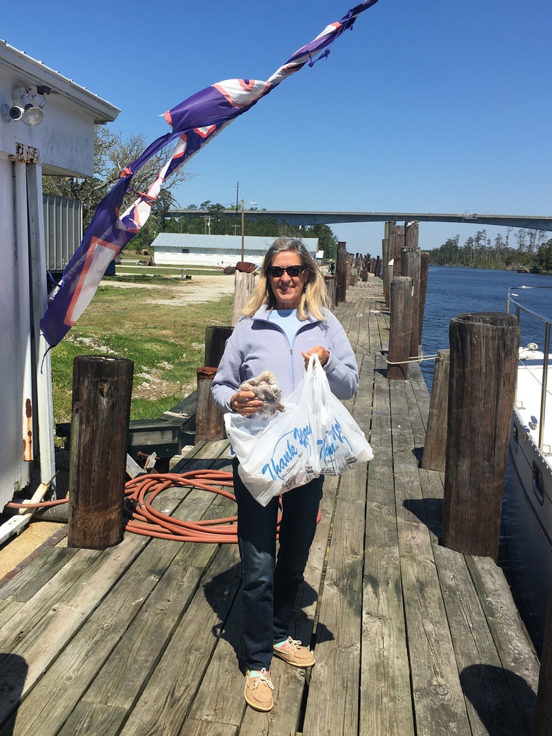 We had passed this somewhat run-down looking shrimp dock in Hobucken, NC called RE Mayo Seafood many times without stopping. Since we were running out of shrimp (our usual shrimp stop in Beaufort didn’t have any since they primarily sell wholesale to restaurants so their shrimpers weren’t even going out) we thought we’d take a look. WOW! Super clean & super nice with a huge selection of shrimp, fish & even lobster. Nearly everything they offer gets unloaded right at their dock. Lori walked out 20 minutes later with a big smile & her big bag of loot. Even the cost was unbelievably reasonable. With their own dock right along the waterway, we’ll definitely be making this a regular stop.