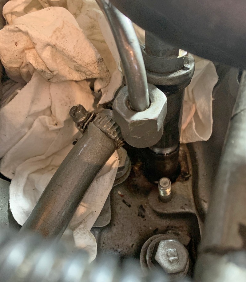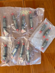 Prepping for surgery with “lap towels” soaked in “blood” (pink dyed diesel fuel), all went fairly well, sent them to the “lab” (diesel injection specialist) & waited. A few days later, the call came “Bad news … tests came back positive for complete nozzle failure”. Oh, well, except for the $1,500+ (cough, cough) cost, it was actually good news as the re-building with new nozzles should provide increased engine performance & make the entire ordeal worthwhile. They were returned as-good-as-new, blister-packed & all. The re-installation went fairly well … until one of the injector mounting plates fell down between parts of the engine. 4 hours later over 2 days, I declared defeat & had to order a replacement.
