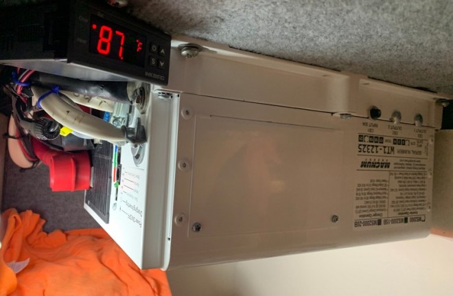 It also inverts our 12 volt battery power to 120 volts to run various small appliances at anchor. Of course, our new Magnum brand charger/inverter is a completely different size & shape, with wiring terminals at opposite locations. Oh, did I mention it weights 45 pounds, is mounted upside down in a very small locker of Lori’s clothes? Theoretically a 3 hour job, 4 mounting screws & a few wires, it took 13 hours, excluding a custom exhaust vent contraption using various Amazon parts, a fan & thermostat (when “cookin” – charging our batteries at up to 106 amps creates a lot of heat!).