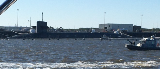 Passing by the Kings Bay Sub Base in Georgia. That guy in the patrol boat isn’t fooling around – his hands are poised on that big gun. A lot has changed since the 60’s when as a kid, we used to be able to boat right up to the subs at the Groton Sub Base in CT. During the Vietnam war, protesters would sneak aboard the subs at night pouring animal blood on & paint anti-war messages on the conning towers.