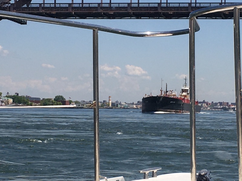 In-between is the East River, including “Hell Gate” with it’s up-to 4 knot current. We planned to have the current with us, but unfortunately nailed the max current at 11:37 AM. While it’s nice to have that much current with you, the turbulence was a bit too much, bouncing us up & down as if on a bucking bronco. Then (of course) we encountered a large ship around a curve at the narrowest bridge opening! Does the water looking boiling? This is nothin’! Hell Gate used to be a canyon of irregular rock causing MUCH worse turbulence. By the late 19th century, hundreds of ships had been lost, resulting in the Army Corp of Engineers performing massive blasting & rock removal operations which continued for 70 years. Not until 1876 was it finally considered safe to transit in all conditions.