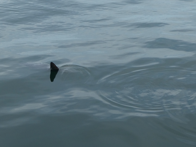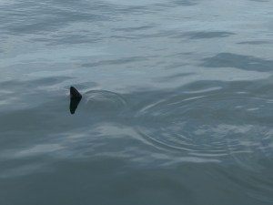 No … but something almost as scary … an Ocean Sunfish. They were given this name as they appear to be sunning themselves while swimming on their sides near the surface. This one appeared to be a youngin’, as adults grow to over 6 feet. This photo is not distorted – they have a very unique roundish shape, including their distinctly shaped tail.