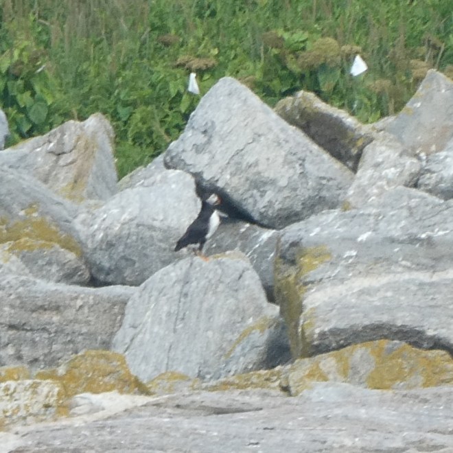 Hard to see & a bit blurry at this zoom level, but this is an Atlantic Puffin we spotted passing Eastern Egg Rock. This tiny island 2 miles off the Maine coast is one of only 6 nesting islands in the entire U.S. Researchers on the island study them while hiding behind wooden blinds. The little white flags are likely marking nests, which the puffins build between the boulders.
