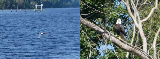 We observe many bald eagles – mostly just (majestically) sitting there. This time in the Alligator-Pungo River Canal, we were treated to a 10 minute show of a pair of eagles “following us” along the canal. At one point, one went “fishing”, caught a small fish, but they fought over it & lost it! This is what a pissed-off bald eagle looks like!