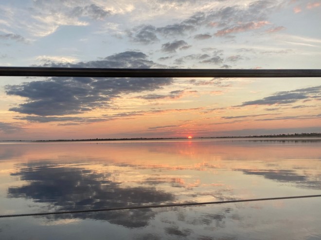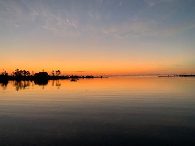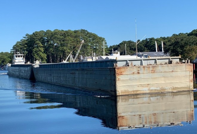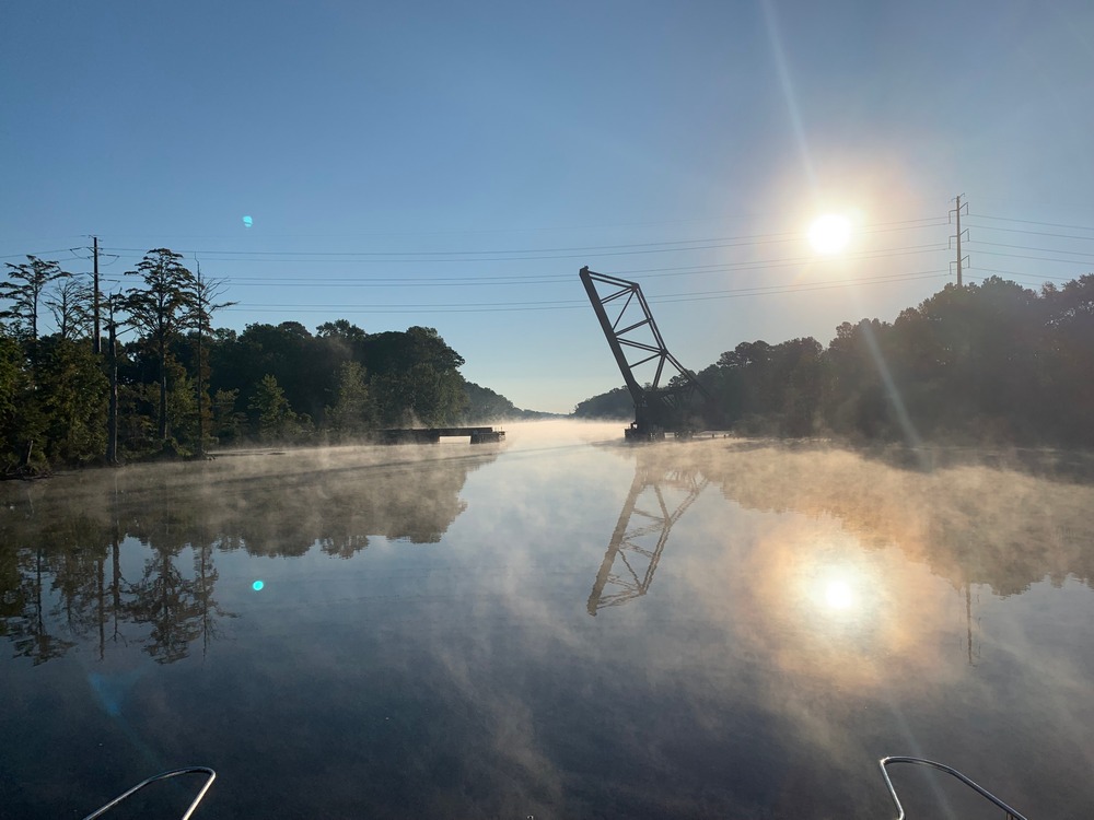 Fortunately after only 12 miles, a few bridges & the Great Bridge Lock, ahhhh … peace at daybreak. No more naval vessels or cargo ships – just the occasional tug & barge.