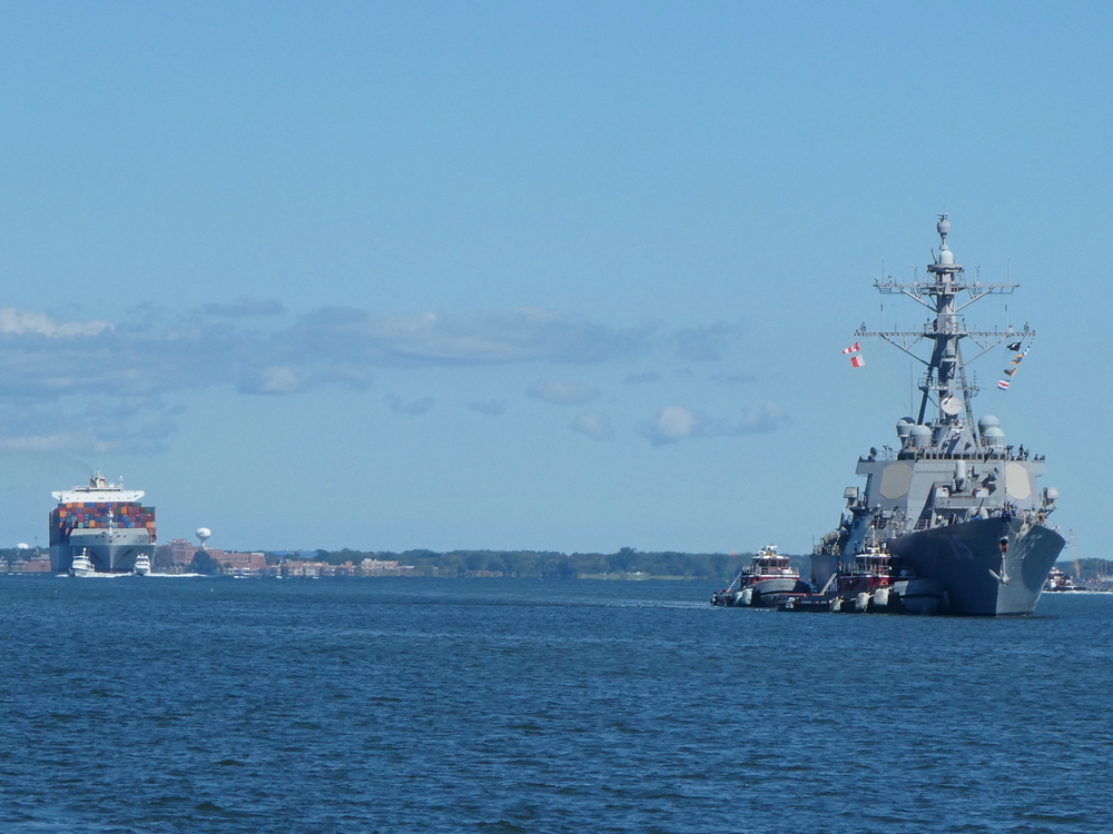 Transiting thru Norfolk is both fascinating & challenging, as it is one of the world’s busiest harbors. Not only does it handle the most & the largest cargo ships on the east coast, it is also home to Naval Station Norfolk – the largest naval station in the world! The warships, of course, are the most difficult challenge to avoid & avoid you must. Blasting on the VHF radio “Warship 75 is entering Norfolk channel inbound to pier #6 – All vessels must maintain a 500 yard security zone at all times”. Not so easy, as the channel narrows, they are zooming at up to 16 knots, then suddenly slow to maneuver or wait for tugs to assist, all awhile other boats of all types/sizes are zipping about & wait – did I mention some of the largest cargo ships in the world?