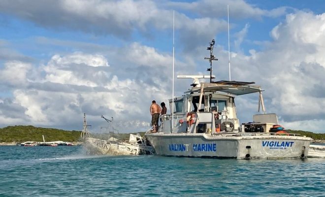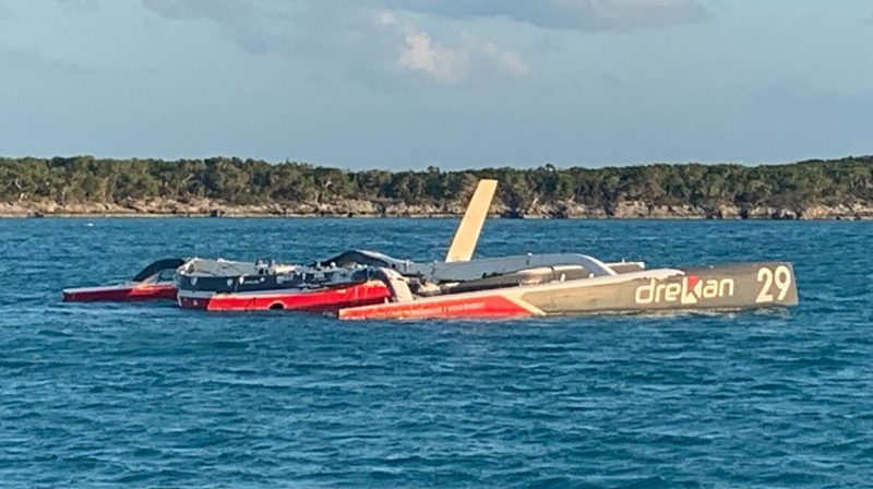 Speaking of wrecks, this trimaran was found offshore & towed here, after crossing the Atlantic – upside-down! This Groupe Drekan 50′ trimaran capsized off Portugal during a transatlantic race in 2017 & 2 years later drifted to off the Bahamas. Last we heard (2 years ago), the French owners were hoping to raise $50,000 to have transported by ship back to Europe for “repairs”…